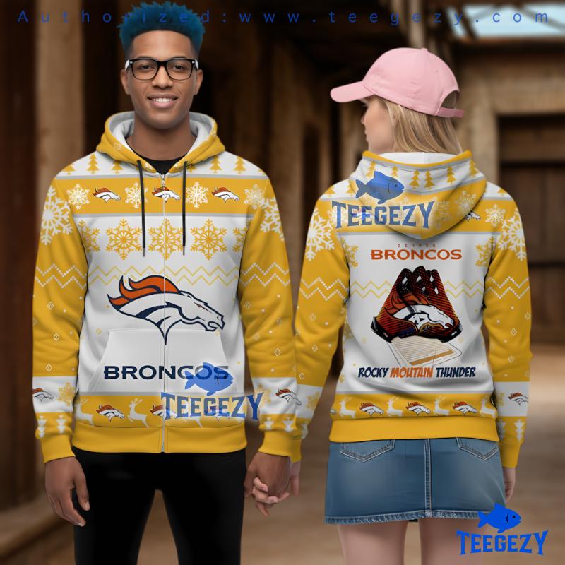 Don’t miss out on this must-have apparel for fans—perfect as a gift for yourself or a fellow Broncos enthusiast. Elevate your holiday wardrobe with the Denver Broncos Ugly Sweater Yellow White Christmas 3D Zip Hoodie, and make this season unforgettable!