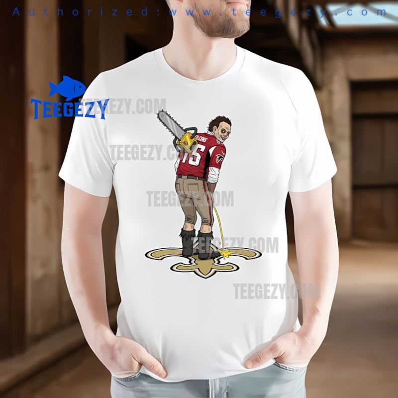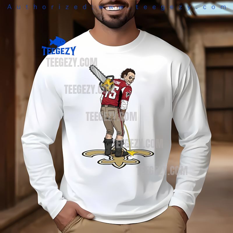 Don’t miss out on this must-have apparel that will surely be a hit among fans. Show your support with the Falcons Leatherface Peeing On New Orleans Saints Logo Rivalry Tee. It’s not just a shirt; it’s a celebration of team spirit and a perfect gift for any fellow Falcon fan!
