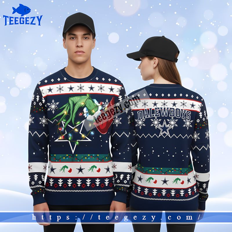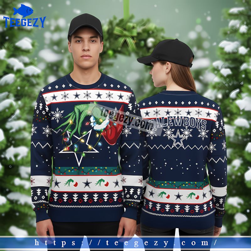 Elevate your holiday wardrobe with this appealing sweater, an ideal gift for fans or simply a treat for yourself. Don’t miss out on the fun—grab your Grinch Hand Dallas Cowboys Funny Ugly Sweater Blue today and make a statement this season!