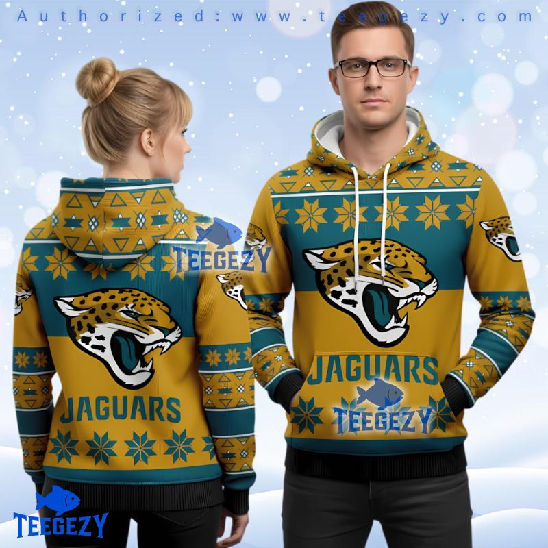 Ready to make an impression? This Jacksonville Jaguars Logo Pattern Ugly Christmas 3D Hoodie Yellow Gold is the perfect gift for fans or a must-have addition to your collection. Embrace the holiday spirit and showcase your team pride with this trendy hoodie!