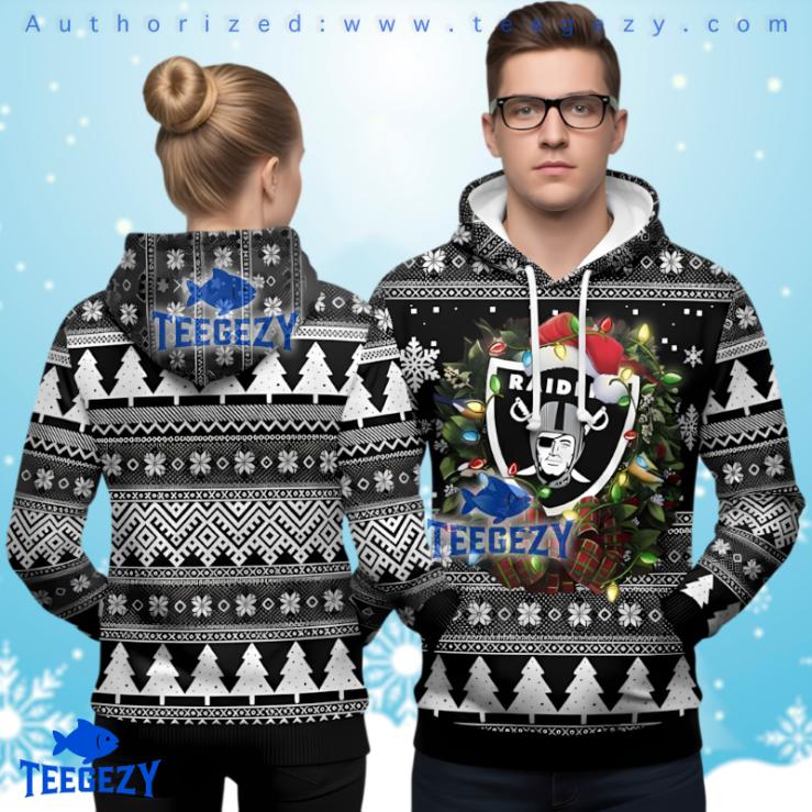 Embrace the holiday spirit with the Las Vegas Raiders Christmas Wreath Ugly Christmas 3D Hoodie, a unique piece that showcases your love for the game and festive vibes. This eye-catching hoodie perfectly embodies the joy of the season while celebrating your team, making it a must-have for any Raiders fan. Its vibrant design promises to stand out, making you the center of attention at all your holiday gatherings.