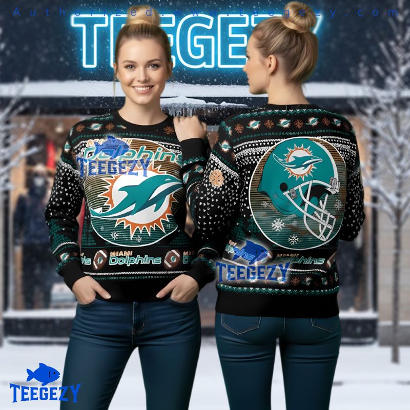 Get ready to celebrate the holidays in style with the Miami Dolphins Official Logo Ugly Christmas Sweater Black 3D Print. This festive apparel perfectly encapsulates the spirit of football fandom during the holiday season, making it an essential addition to your winter wardrobe. Show off your team pride while embracing the charm of an ugly Christmas sweater that stands out at any gathering.