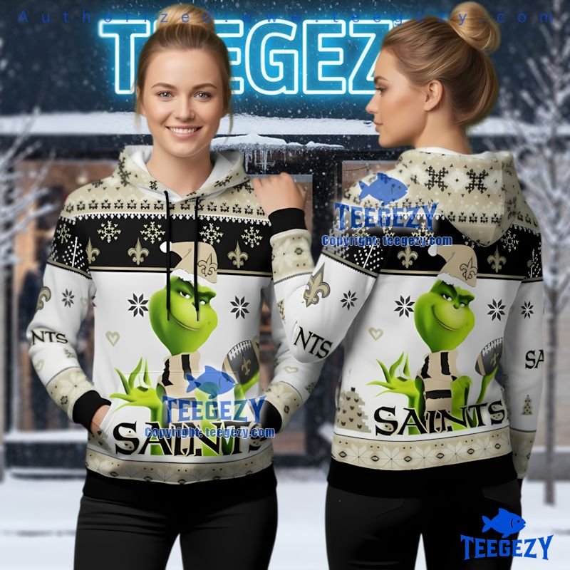 Don’t miss out on this must-have addition to your Saints collection. This festive sports team apparel is the ultimate way to showcase your love for the team and spread holiday cheer. Grab your New Orleans Saints Grinch Santa Hat White Black Ugly 3D Hoodie today and let the good times roll!