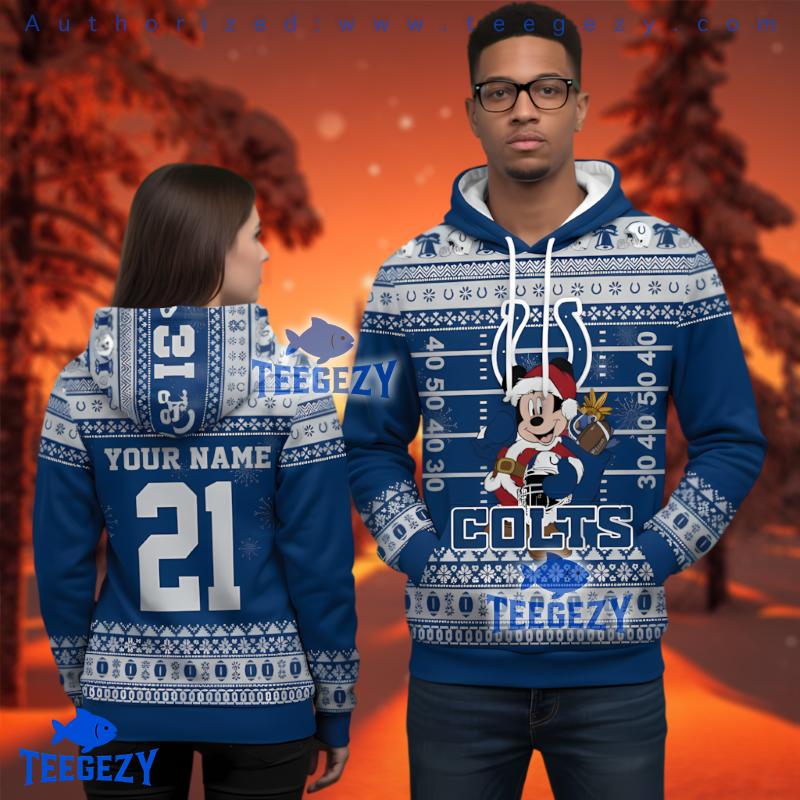 Step into the festive spirit with the Personalized Indianapolis Colts Mickey Mouse Ugly Christmas 3D Hoodie Pullover. This unique design brings together your love for the Indianapolis Colts and the magic of Mickey Mouse, making it the ultimate blend of fun and team spirit. Celebrate the holiday season in style, showcasing your fandom and festive cheer through this standout piece.