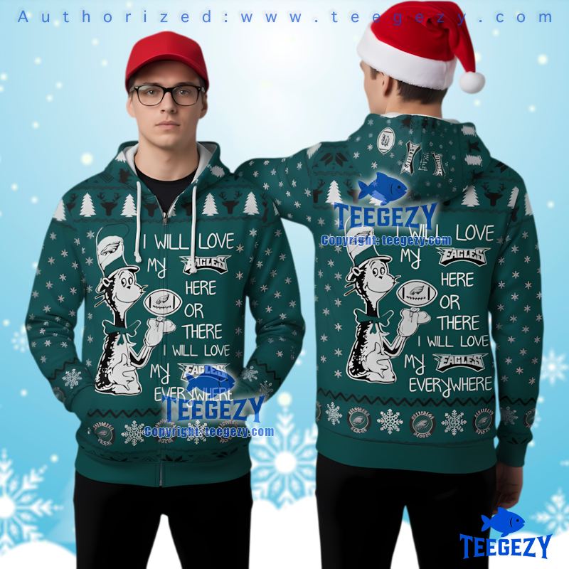 Make every festive gathering a little brighter with this must-have apparel for football fans. Don’t miss out on your chance to celebrate in style—grab your Philadelphia Eagles Cat In Hat Ugly Christmas 3D Zip Hoodie today and spread the holiday cheer!