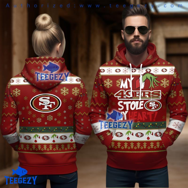 Wrap yourself in holiday cheer with the San Francisco 49ers Grinch Stole My Heart Christmas Ugly 3D Hoodie. Celebrating the spirit of the season, this hoodie combines festive fun with a beloved football team’s vibrancy. It’s the perfect way to showcase your team pride while spreading some holiday joy, making it a must-have for any dedicated fan.